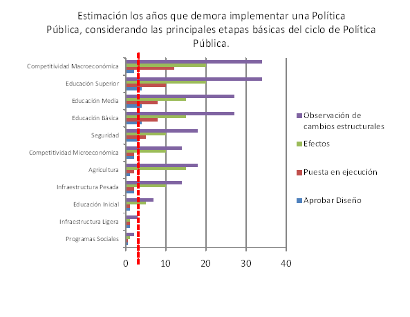 Como se puede observar, en términos generales existe un proceso de aprobación del diseño de la política pública, la puesta en ejecución, los efectos y finalmente la observación de cambios estructurales. Considerando estas etapas, se puede observar que hay políticas públicas cuyos efectos se pueden ver en algo más de un año y otras cuyos efectos se pueden ver dentro de más de 30 años. La línea de puntos representa el cuarto año, donde se supone que hay un cambio de gobierno Municipal o Regional. Luego se pueden ver los siguientes temas a modo de ejemplo.