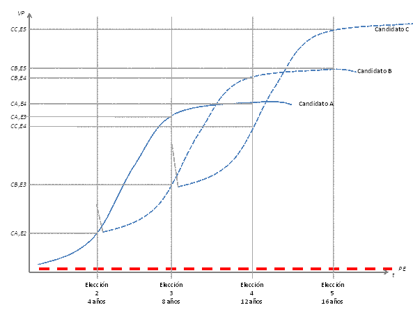 En el siguiente diagrama se presenta, una alternancia en el poder en la elección número tres, a los ocho años de gobierno del candidato A. En este sentido, el candidato B es capaz de generar una mayor oferta de Valor público a los electores, mientras que para el caso del candidato A se espera pocos incrementos del Valor público, y más bien un sostenimiento que es consistente con los supuestos descritos al inicio de la explicación de este modelo.
