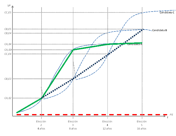 Diagrama 2. Rendimientos máximos de Valor Público entre el Candidato A reelegido constantemente y el resto de candidatos alternando el poder en cada elección cada 4 años